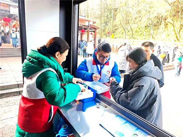 一声声清晰有力的提醒,让刚下车的游客快速明确游览方向。同时,现场设置的多个志愿服务点还提供免费热水、应急药品、景区导览图等便民物品,全方位满足游客的不时之需。