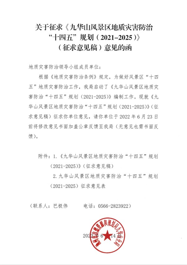 【部门征集】关于征求《九华山风景区地质灾害防治“十四五”规划(2021-2025)(征求意见稿)》意见的函