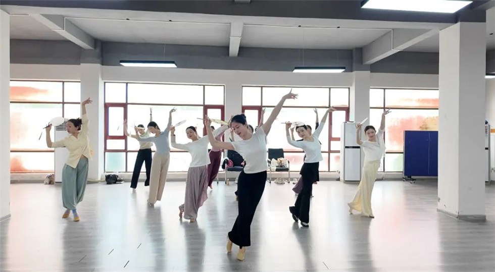 培训现场,学员们身着练功服,在悠扬的古典乐曲中,跟随老师的示范动作认真学习。