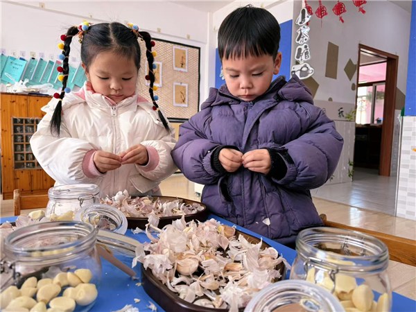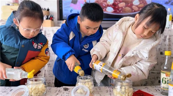 最受欢迎的环节,莫过于亲手制作腊八蒜。孩子们仔细洗净小手,围坐一起,耐心地将蒜瓣一一剥开,专注的神情里满是认真。剥好的蒜瓣被轻轻放入透明的罐中,倒入米醋与白糖,密封、贴签,一套流程充满仪式感。每一罐贴上自己名字的腊八蒜,都是一份关于等待与变化的期许。