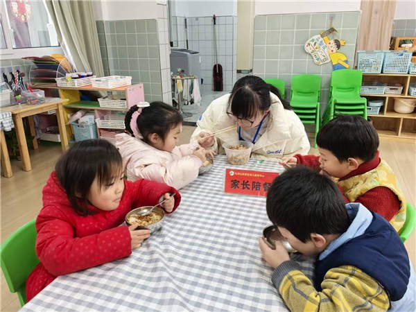 除了常态化的检查之外,委员们积极到园进行家长陪餐。他们与孩子们同桌就餐,亲口品尝当日餐点的口味与口感,这不仅是对菜品质量最直接的检验,也让家长更近距离地观察孩子们的进餐情况与喜好。每次陪餐后,膳食监督家长会员成员们都会组织座谈会,向园方及时反馈家长们对菜品搭配、口味调整、时令食材选用等方面的意见和建议,这些来自“用户端”的鲜活反馈,被迅速汇总整理,成为园方优化每周带量食谱、改进烹饪工艺的重要依据。幼儿园还定期开展膳食满意度问卷调查,将委员会的定点监督与全体家长的普遍反馈相结合,进一步提高食堂的膳食质量。