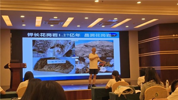 紧接着,安徽省地质调查院吴维平教授对九华山地质景观深度解析。"这块紫色晶体里的氟与钙结合,就形成了九华山最常见的花岗岩",他通过化学元素与实地景观的关联,揭示出岩石中隐藏的化学浪漫。“九华山不仅仅是一座山,它是一本打开的地质教科书,一段凝固的历史长卷,更是一种人与自然和谐共生的哲学表达。”吴教授的一席话,引发了营员们的深深共鸣。