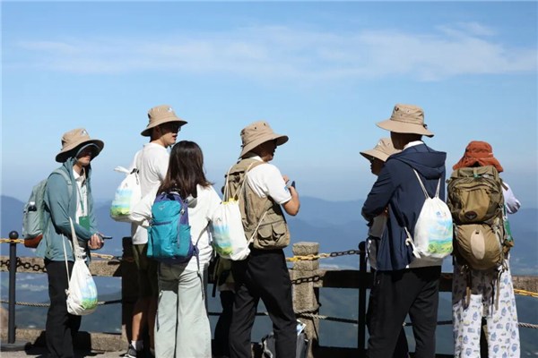 清晨,志愿者们乘索道抵达花台景区,沿景观栈道一路徒步向天台进发。山风拂面,云海翻涌,“妙有分二气,灵山开九华”的诗意意境与眼前的壮丽景色交相辉映。极目远眺,“峰—丘—盆”的地貌格局层次分明,母子情深、龙抬头、仙人晒靴等象形奇石惟妙惟肖,仿佛大自然的画笔在山水间自由挥洒。