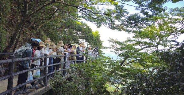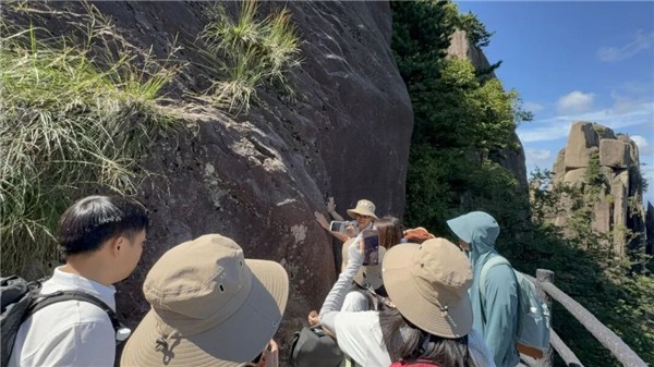 志愿者们放飞想象,不时发出由衷的惊叹。在安徽省地质调查院吴维平教授的带领下,大家仔细观察花岗岩的节理发育和象形石景观,聆听地貌形成的科学解读,对九华山世界地质公园的成因与价值有了更直观、更深入的理解。与此同时,生态组的志愿者们专注于捕捉自然的生机:辨识林木、聆听虫鸣、记录观察,对景区内动植物作出细致的观察记录与热情的分享介绍,让行程更添生动与活力。