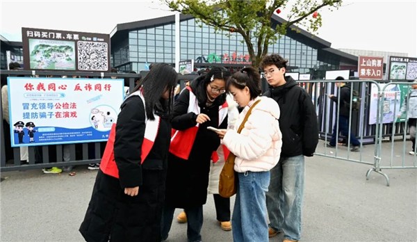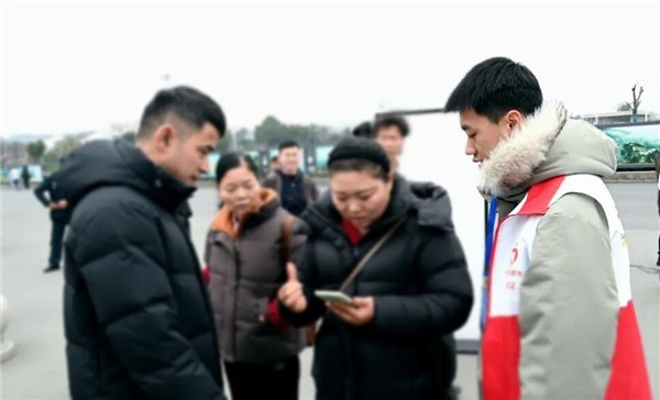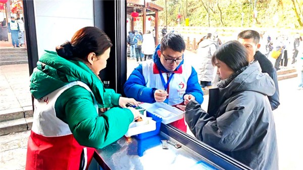 一声声清晰有力的提醒,让刚下车的游客快速明确游览方向。同时,现场设置的多个志愿服务点还提供免费热水、应急药品、景区导览图等便民物品,全方位满足游客的不时之需。