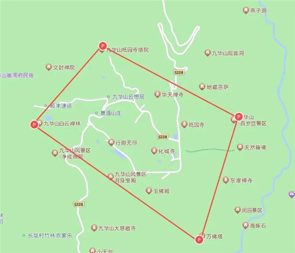 (三)九华山风景区核心景区:九华山白云禅林西侧20米、祇园寺塔院北侧、百岁宫景区东侧、万佛塔南侧四点范围内。坐标点: