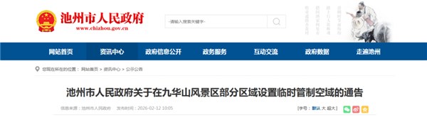 池州市人民政府发布关于在九华山风景区部分区域设置临时管制空域的通告