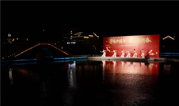 在相逢桥至玉带水街,看古风舞蹈踏歌而起。舞者们衣袂飘飘,翩若惊鸿,与蓝天古建筑相映成画,每一个转身回眸,都似从古典画卷中走来。